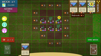 Once a Plant Card has reached Maturity, they score the player some points and give some benefits. The player may discard Cards from Hand to gain Effort which is used to acquire new Cards from the Shed and new Tiles in the Garden. Once a player has completed all their moves, they can hit the End Week button and see how their Garden grows.